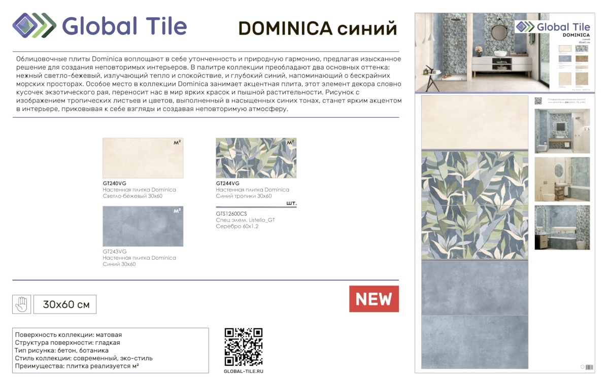 GT243VG Настенная плита GlobalTile Dominica_GT Синий 30x60 _ 1/58,32
