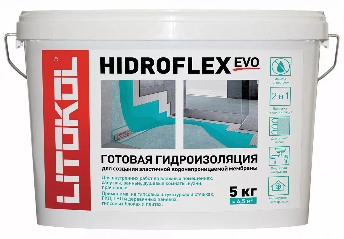 Hidroflex предназначен для гидроизоляции поверхностей стен и полов внутри помещений перед керамической облицовкой: