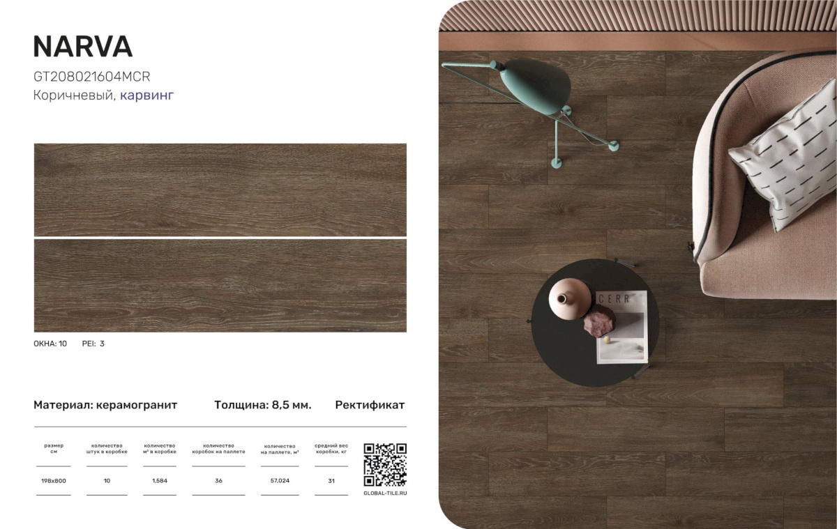 GT208021604MСR Керамогранит GlobalTile Narva_GT Коричневый 19,8x80 _ 1/57,024